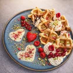 Grilovaný hermelín, niva, máslová houska, polníček, rajče, salátová okurka, andaluzský dresing